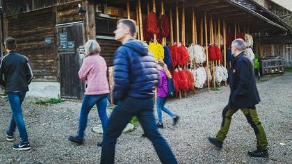 Wolle von vier unterschiedlichen Schafrassen, in Hessen nachhaltig und ökologisch gefärbt, wird im oberen Rinnetal verarbeitet und bis hin zu den halbmechanischen Webstühlen und der eigenen Garnproduktion konnten wir uns ein Bild davon machen, wie im ökologischen Sinn, unter fairen und regionalen Bedingungen wunderschöne Teppichunikate entstehen. Von der online-Konfiguration bis hin zum grünen – statt roten – Teppich auf einer Gala in Berlin erkundeten schon einige Teppiche aus Rückersfeld den Globus.