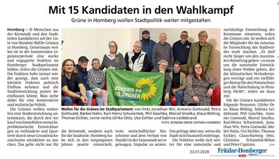 Homberg – 15 Menschen aus der Kernstadt und den Stadtteilen kandidieren auf der Liste von Bündnis 90/Die Grünen in Homberg. Gemeinsam wollen sie in der kommenden Legislaturperiode eine starke und engagierte Fraktion im Homberger Stadtparlament bilden, teilen die Grünen mit. Die Fraktion habe immer wieder gezeigt, dass auch eine kleinere Fraktion politisch Einfluss nehmen und die Stadtentwicklung positiv beeinflussen könne. Man stehe dabei für eine konstruktive und realistische Politik.